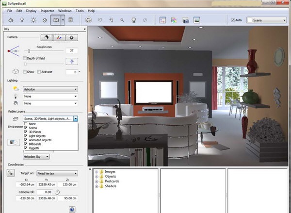 Artlantis与这领域的领导者Bionatics和VBVisual合作开发的3D植物像普通对象一样可通过“拖放”摆放。另外它们具有惊人的调节能力:植物的树叶属性,如密度和颜色会随着Artlantis日光定义面板下的季节而改变。