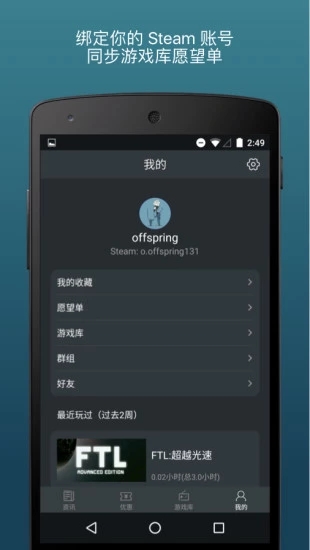 支持绑定 Steam 账号,绑定账号之后可以同步你的 Steam 游戏库及愿望单,之后在你游戏库和愿望单中的游戏也会被标示出来。你甚至还可以查看你愿望单中所有达到历史新低的游戏,不再错过你想玩的任何一款游戏。
