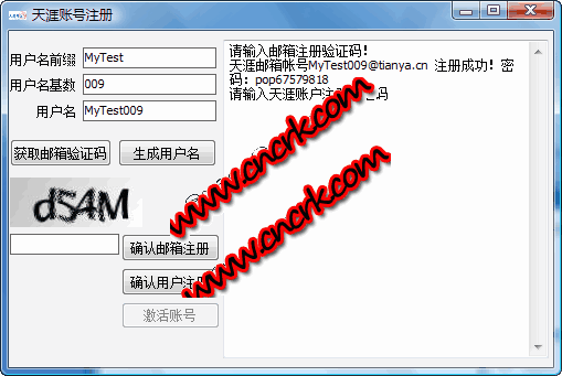 天涯论坛账号自动快速申请器自动批量注册天涯论坛账号,方便广大灌水爱好者。另有批量登录,信息群发,自动识别验证码功能。