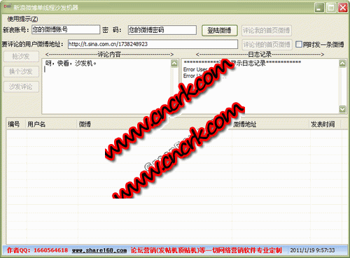 新浪微博群发顶贴器需要您的个人账号和密码登陆您的主页,然后可以遍历您的个人主页最新的微博并对他们批量评论因为是程序自动评论的,两次评论间的耗时仅为几毫秒,所以会被微博认为是刷评器,一般评论七八条就不能在评论了
