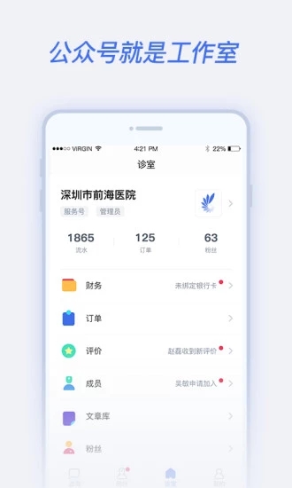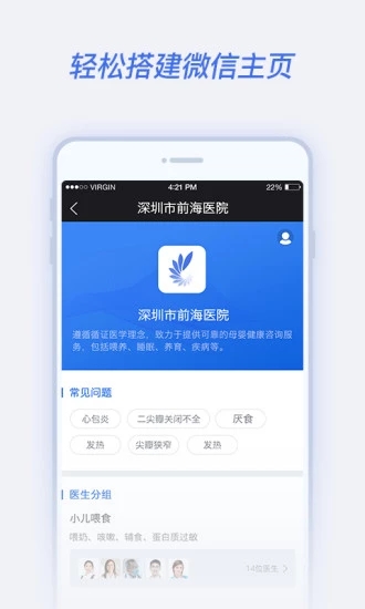 1.一分钟搞定公众号主页:只需3步,完成搭建,传播品牌;2.用自己的公众号跟患者沟通:比个人微信更隐私,微信关系链传播,建立信任;