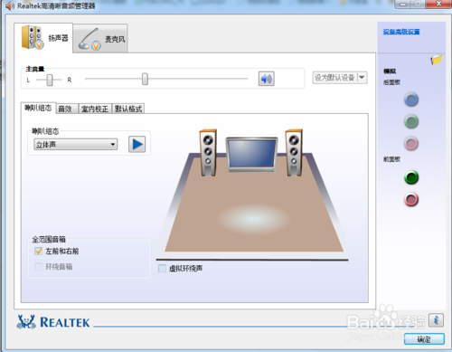 2、进入Realtek高清晰音频管理器页面,我们首先看到的是扬声器页面,通过喇叭组态调整喇叭的声音,如下图所示。