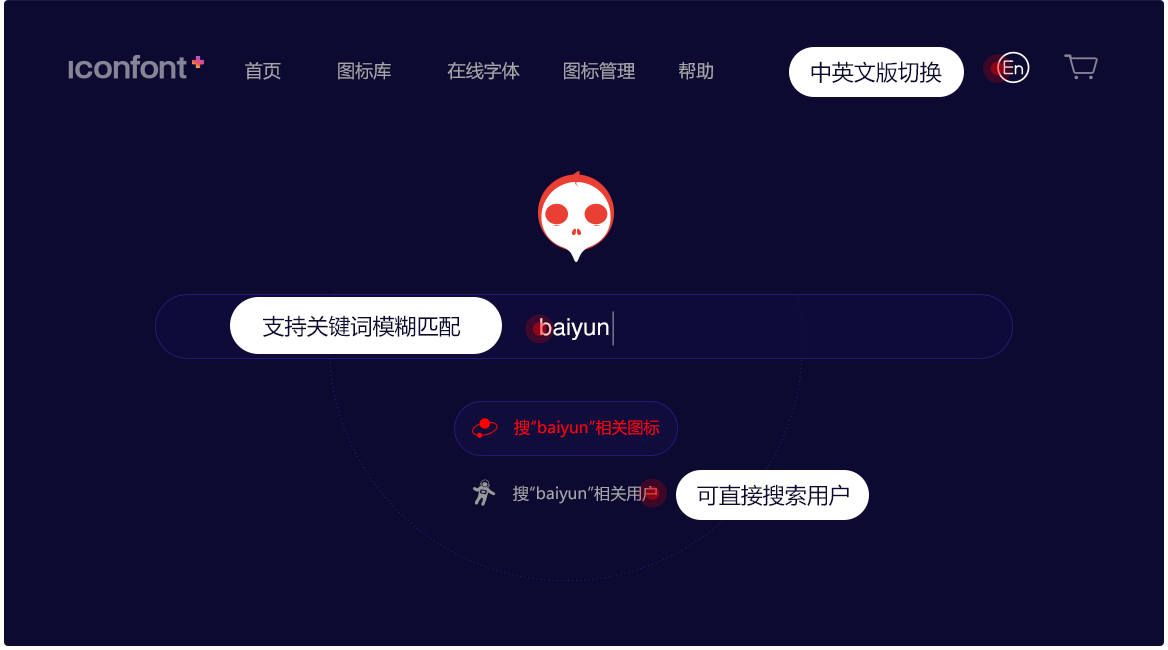 搜索:支持关键词模糊搜索,可以搜图标搜用户,中文/English/Pingyin无缝互译