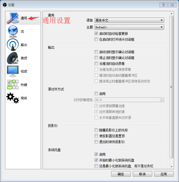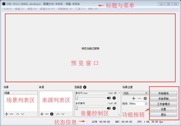 1、打开主界面主界面场景:场景相当于PS作图,场景是主图,来源是图层,你可以多设置几种不同的画面