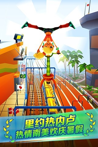 该游戏是一款堪比神庙逃亡的经典跑酷游戏。游戏的画面绚丽精致,色彩繁多让人感觉很舒服,在操作上非常顺畅,并且干净利落。通过简单的向上划,向下划,向左向右划来躲避障碍和迎面而来的火车,帮助主人公躲避脾气暴躁的警察和他的狗的追捕。在空中也可以左右改变方向,还可以通过双击屏幕调出滑板,在有限的时间里相当于增加一次生命。游戏中还包含了如弹簧鞋等多种道具。