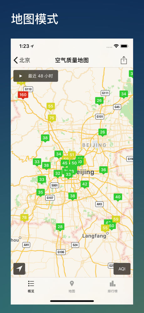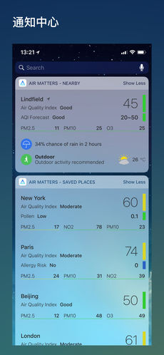 1、支持查询超过 50 个国家、10000 多个监测点的空气质量信息,能够根据所在位置显示附近的监测点的监测数据。
