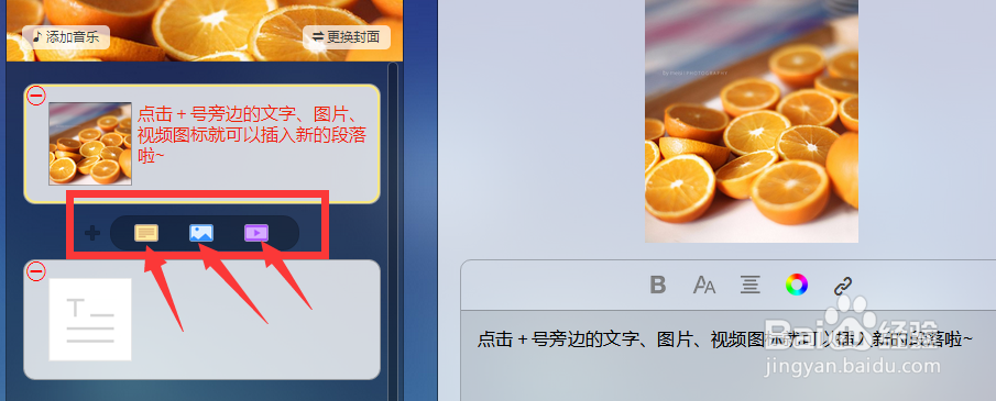 8、在任意位置点击“+”号,会弹出插入选择框。你可以插入纯文字、图片或视频。