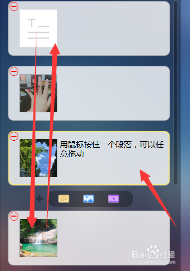 9、纯文字、图片+文字、视频+文字均构成一个段落。你可以点击左上角“删除”按钮把段落删除,也可以点击右侧“上”、“下”箭头,整体移动段落。