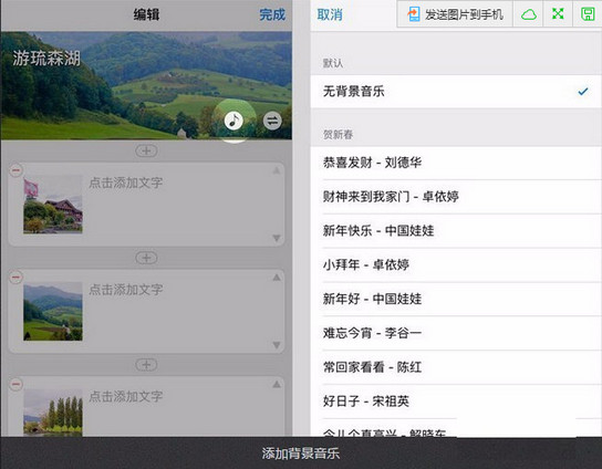 5、点击“音符”图标,可以给文章设置一首背景音乐。因为在上班、深夜等情况下突然放出声音比较吓人,我们建议你谨慎添加音乐。