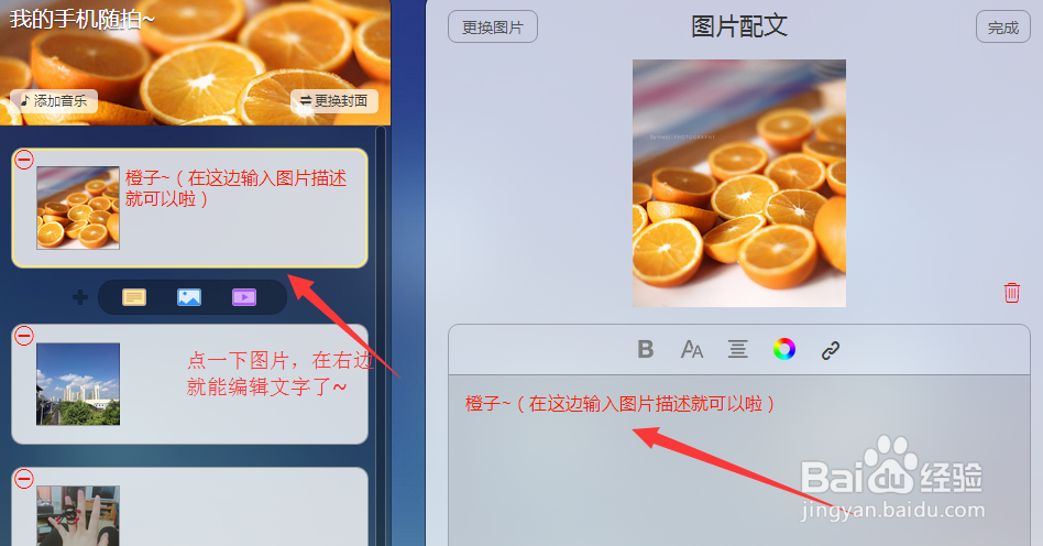 7、点击图片右边的区域,可以给图片增加文字描述。文字可以设置粗体、大号、居中、彩色等。
