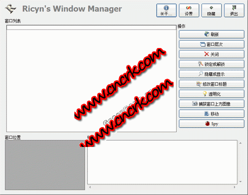 系统窗口管理器 V1.4 简体中文绿色免费版 系统窗口管理器是一款windows窗口管理器,普通的窗口操作一应俱全,包括获取窗口信息和所属进程,枚举窗口,窗口层次调整,关闭/退出窗口,结束窗口进程,锁定和解锁窗口,改变可见属性,更改窗口标题,设置透明并调节窗口透明度,设置鼠标穿透,截取窗口上方图像(以供复制或保存),移动相关窗口(哪怕它不给你直接用鼠标拖拽),和编程人员会用的spy……