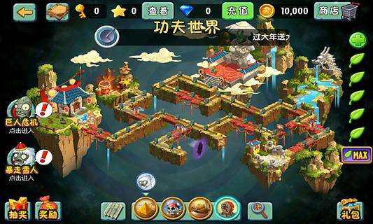 新的冒险在《植物大战僵尸2》中,玩家所涉及的游戏世界不再局限于前院后院了,新作将带给玩家视野开阔并且灵活多变的冒险世界。在神秘埃及,有阻挡射手攻击的墓碑与僵尸沙尘暴的突袭;海盗港湾地图中,有直接降落于场地前方的飞索僵尸,还有从无甲板的行列进攻的海鸥僵尸;狂野西部地图中,有可以上下滑动的轨道矿车,能够灵活变换植物的作战位置,但同时也缩小了种植区域;功夫世界地图中,出现了种下植物可以收获能量豆的太极地块,以及为普通僵尸提供道具的兵器架。