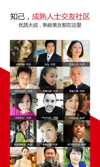 1、由知己网打造的两性交友应用。它和陌陌、探探、百合、佳缘、珍爱等交友平台相似,不过知己APP主要面向大龄、成熟人群,尤其适合30岁以上的中年单身人士交友、同城约会相亲,以及离异人士征婚。在这儿,有大量优质大叔与熟龄美女,他们都在寻觅有缘的婚恋对象或亲密伴侣。