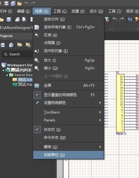 3、在毫米和mill之间的单位切换是按Q键或者在视图下的单位切换选项如图: