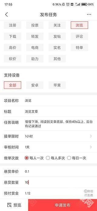 4、选择完类型和支持设备后,项目名称可以填浏览+平台,项目名称将作为标题的标签,所以标题填浏览文章接下来是任务说明,可以在这里写上注意事项和要求,比如要求阅读长,用什么来阅读