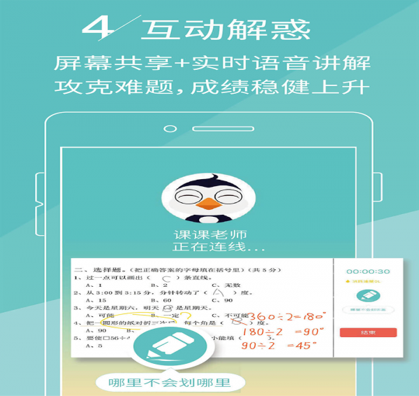 3.作业疑难:对作业中出现的疑难问题,直接点击疑难题目,与老师连线讲解,帮助孩子复习和巩固所学新知识,不产生知识积压;