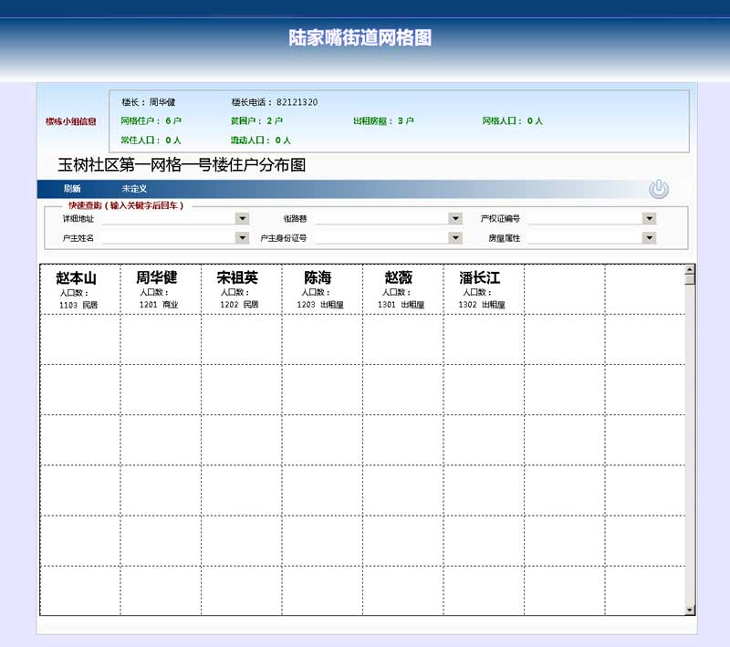 1、网格化信息管理:按【街道】>【社区】>【网格】>【楼栋】>【门牌号】的级联方式对辖区的基本信息进行管理,以地图(或示意图)的形式直观展示各级管理层的分布情况、住户情况、人口情况等。2、住户信息管理:对辖区内的住户基本信息、地理定位、住户人口信息等进行了管理,既可以按【街道】>【社区】>【网格】>【楼栋】>【门牌号】直到住户人口(以户找人)的级联方式查询人口,也可以按【人口】-【住户】….的方式(以人找户)查询住户或辖区信息。