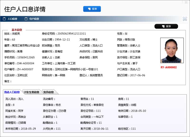 3、人口信息管理:对人口的基本信息、工作信息、社保信息、计生信息等,进行了全方位的管理,自动生成信息报表和分类统计图。