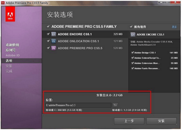 5.在进行安装选择的时候,注意选择安装位置;默认状态下,安装全部软件和组建,也可以根据自己的需要取消一些程序的安装!