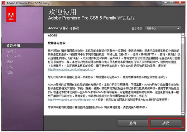 3.安装程序选择中文,点击接受协议。