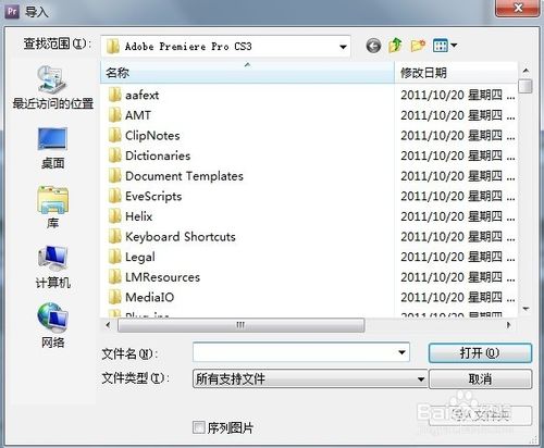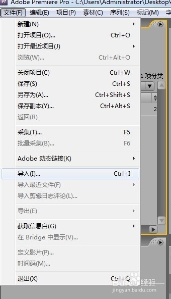 3、在项目面板导入视频有三种方法:1. 选择文件→导入命令。2. 双击项目面板(空白处) 3. Ctrl+I快捷键