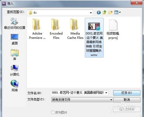 4、找到视频点击打开就导入项目面板了(视频格式最好是WMV的,可以用格式工厂转一下视频的格式,有的格式导不进来)