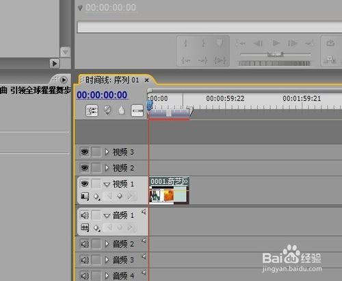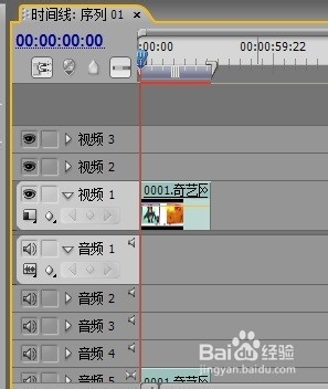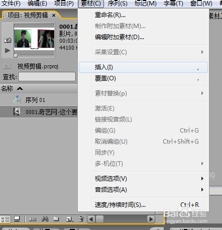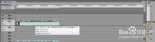 5、注意这一步,把鼠标放在视频上按住左键不放拖到时间线里,或是选择素材插入命令,将视频插入时间线中