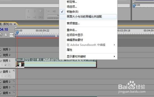 7、在素材上用右键单击,在弹出的菜单中选择适配命令,适配的视频大小。