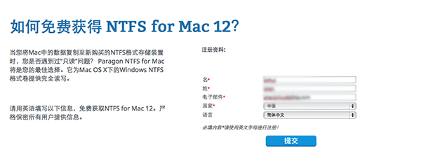 NTFS for Mac一直是Mac OS平台上最受欢迎的NTFS硬盘格式读取工具,有了NTFS for Mac,安装了双系统的Mac用户可以在OS X系统下直接读取和写入windows系统下的NTFS硬盘格式,解决了双系统下,硬盘格式互相不兼容的问题。但是NTFS for Mac作为一款商业软件,其正版软件一直都需要花费不小的金额来购买序列号进行激活,下面小编就教各位如何免费获取NTFS for Mac的正版序列号的方法。(免费计划版本仅支持OSX 10.10及下版本系统,请注意!)1、此次Paragon公司推出NTFS for Mac免费计划,针对个人用户,您只需要前往NTFS for Mac 12 Special Edition 版本注册页面就可以注册成为NTFS免费计划的一员。