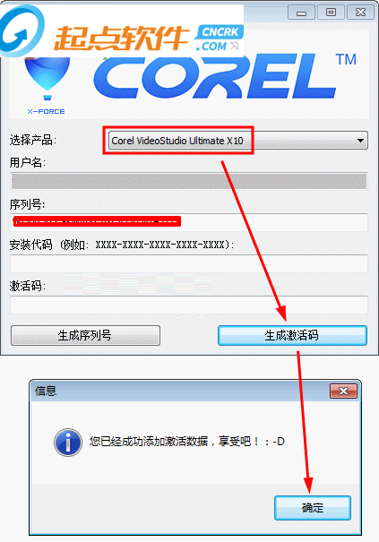 10、想要破解的用户可以使用corel注册机来进行破解,在安装之后双击打开程序,将软件设置为:“Corel VideoStudio Ultimate X10,然后点击下方的生成激活码即可!