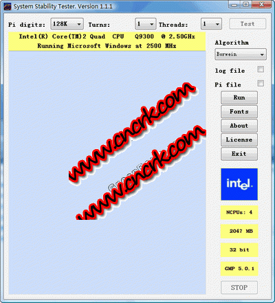 system stability tester通过计算小数点后1.28亿位的pi值来测试系统稳定性,计算算法是borwein二次收敛法。测试过程创建两个或者多个线程,在每一步计算完成后,程序会比较各个线程的计算结果,这些结果有任何差异都会向你报告。软件可以最高创建32个线程,可识别cpu型号,生产厂商和工作频率,可连续运行50次,并记录下每次计算每一步的计算结果,最后可以将pi计算结果记录到文本文件中。软件支持xp、vista等系统。