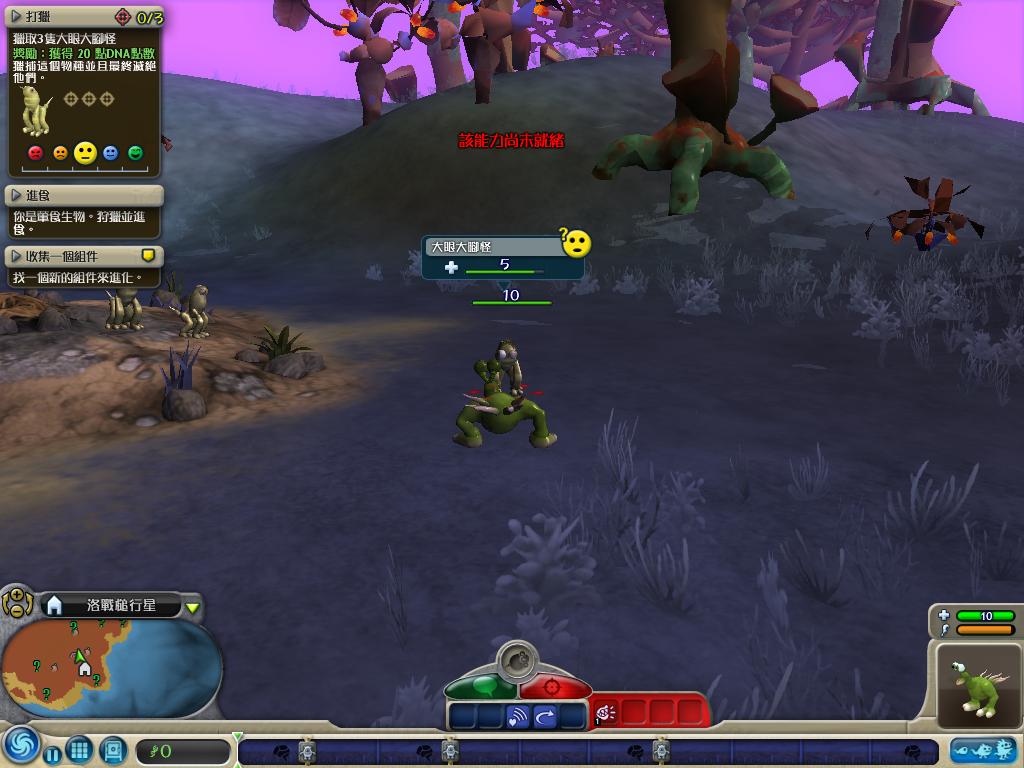 3、如果你打算在这阶段一路杀过去,那就没什么好说的,杀就是了,简单模式下很容易就杀过这一阶段。如果你打算在这一阶段不杀的话,那就要与别的生物唱唱跳跳了。与别的生物唱唱跳跳是有技巧的,那就是每回等别的生物先动,看他们在干嘛,然后你就学他们干嘛(不外唱、跳、迷、势四种),这样成功讨好别的生物的机率大了很多很多。