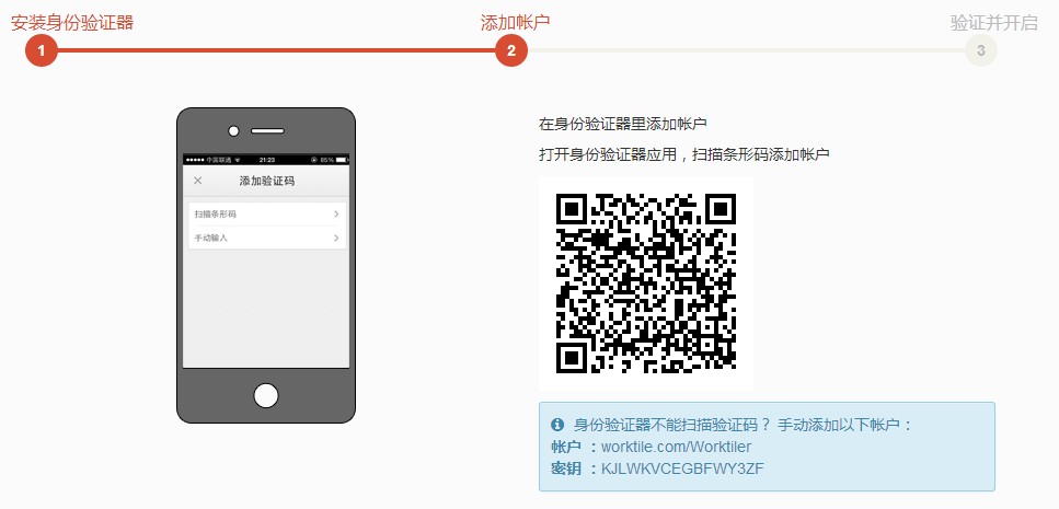 点击进入下一步,在身份验证器上添加您的Worktile帐号: