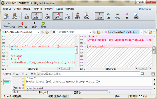 4、在文本合并会话界面中,用带有问号图标的鼠标箭头直接点击右侧窗格的第13行,即可完成强制文本对齐的设置,操作结果界面如下图所示。
