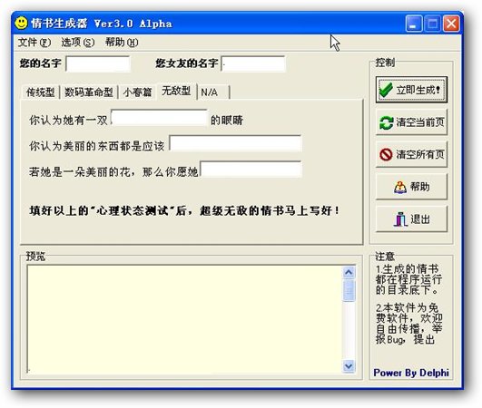 情书生成器 V3.0 简体中文绿色免费版 情书生成器可以帮助你完成你想写的情书,生成出来的情书是没有任何破绽的(看不出是有计算机来完成的),情书生成器能够生成四种风格各异的情书。