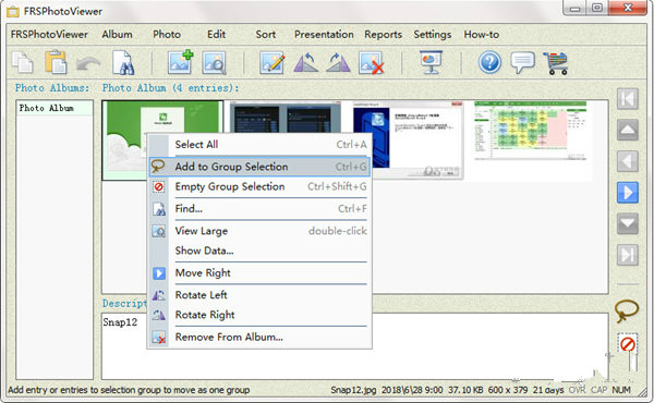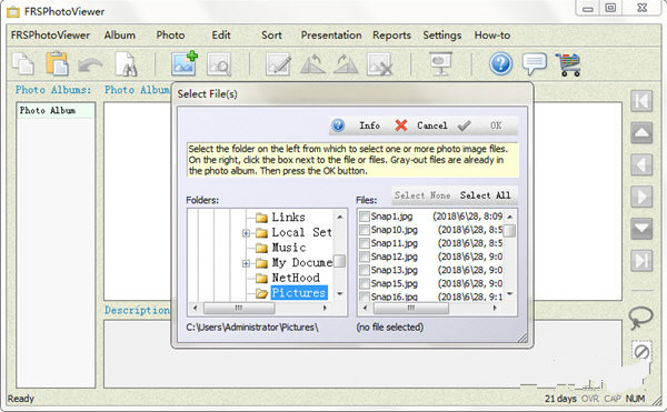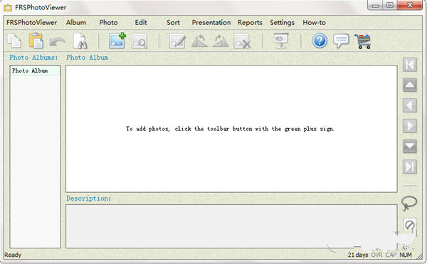 安装应用程序后,FRSPhotoViewer 会为您添加一个默认的空相册。单击“照片添加照片”菜单命令(或其匹配工具栏按钮)选择照片或照片,您想添加到相册。