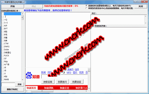 百度知道自动检举器 V1.4 简体中文绿色免费版 百度知道自动检举器用于自动检举/投诉百度知道中的违规问题,提供2种投诉方式,分别为:直接检举;投诉到百度投诉中心。百度知道自动检举器使用方法:使用百度账号进行登录,同时要选择记住登录状态,登录后输入描述,选择投诉方式,按开始键开始。