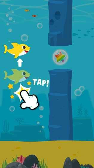 轻按鲨鱼宝宝,让他游来游去并吞食星星泡,但要当心障碍哟。