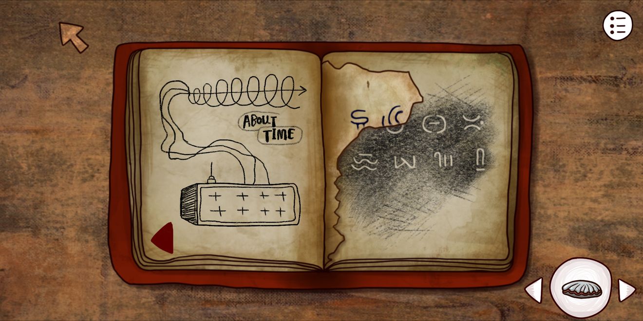 然后点开左边的收音机一样的东西,将时间石块放进去,并根据我画的图和书本最后一页的密码对应起来,把收音机上的蓝点点亮,时光机器打开。