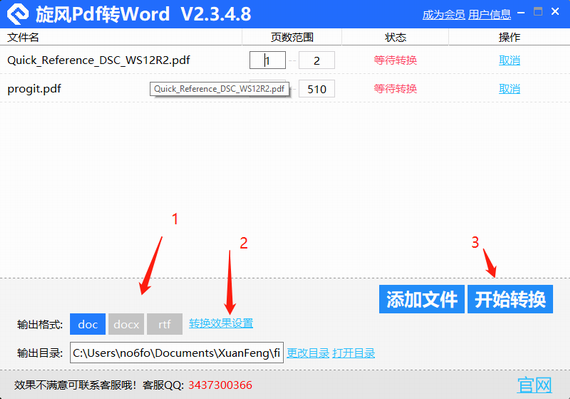 完成添加文件之后,您还可以选择设置输出的文件格式,比如doc,docx,rtf等,如果某种格式转换失败的话,您还可以尝试将它们转换为其他格式。您也可以设置转换效果或者直接默认设置直接开始转换。如下图所示: