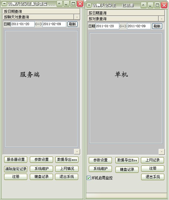 qq聊天记录王(能记录qq2010版的聊天记录,新增:本软件具有免查杀功能,优惠期间只要注册服务端,就能查询所有客户端电脑qq聊天记录),系统主要面向家庭、企事业单位,用于监控qq聊天记录和上网网址和内容,本软件以图文的形式再现当时qq的聊天内容,还可以把聊天内容导出成独立运行的exe文件,极大的方便了聊天记录的浏览,使用本软件后,在家庭可以防止孩子交上不良朋友,及时了解孩子的思想状态,企业可以规范员工上网行为,减少员工聊天和干私事,大大提高员工的工作效率,本系统采用科学的压缩算法,使用图片所占容量大大缩小,极大的提高了系统速度和节约了硬盘空间。