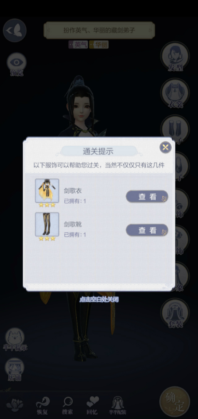 我根据月半半的提示打开了发型、衣裳、鞋子三个界面,根据提示得知服装要“英气”与“华丽”兼备,于是找到了“剑歌套”。