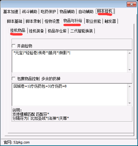 4、物品与补给:挂机前一定要开启捡物模式,设置好捡取的物品名称和数量,常备为:元宝、经验卷、传奇、皓月、刺影等等。数量也可设置,以免物品过多,背包装不下。