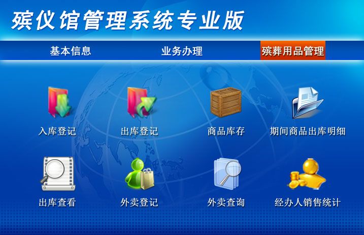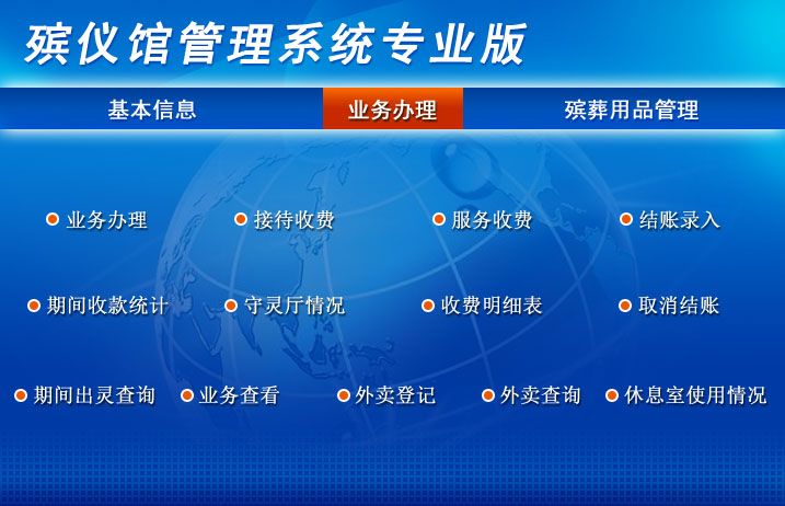 《殡仪馆管理系统专业版》是一款适合殡葬服务行业的专业软件,软件集成了殡仪馆周密的业务流程,包括业务办理(登记逝者及联系人的信息),接待收费(录入接待项目的费用),服务收费(登记服务项目的费用),结束后统一结账,打印收费收据;另针对零散的业务,可以在外卖登记中登记。殡葬用品管理(包括殡葬用品的入库出库库存及殡葬用品的外卖登记)等。软件提供打印单据,统计收费情况及灵堂使用情况等功能。各个环节紧密联系,系统运用了数据处理,减少了录入数据的工作量,提高了工作效率,在网络上运行,将更能体现其强大的功能、高效的运转,多人共享数据的流程应用操作,件简单易用,会是您工作的好帮手。