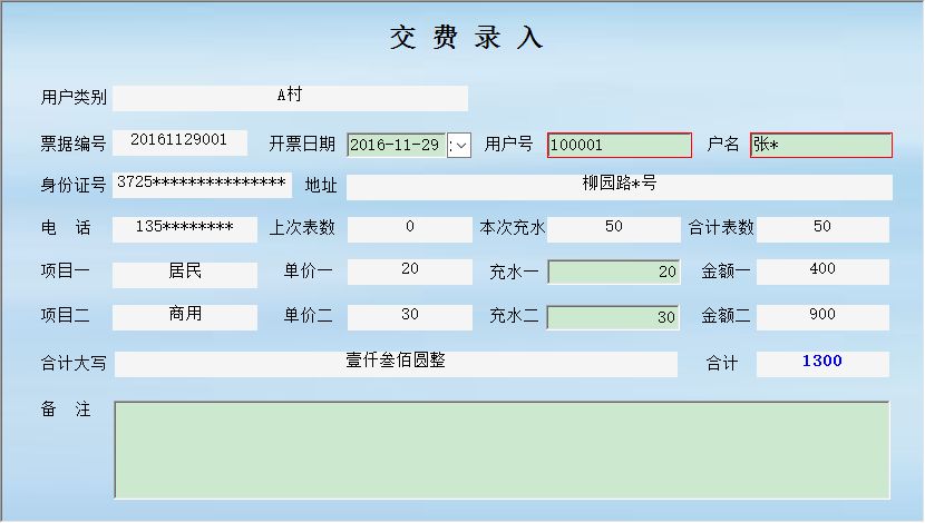 《水费管理系统——预付费版》方便预付水费水厂管理水费的一款软件,针对根据预付水费金额设定水表,水表停止后说明费用已用完的管理办法而设计的。 软件功能包括:单位信息、用户类别设置、收费项目设置和用户信息等基础信息的设置; 当天交费录入、按客户查询、修改最后一次交费、期间查询、当天日报表。月报表和年报表。收费后打印241-3等份纸型的收据。