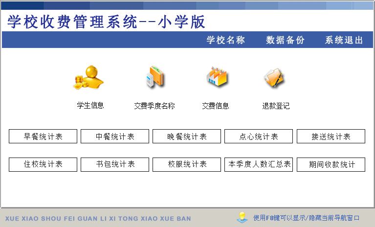 《学校收费管理系统--小学版》软件侧重于幼儿园小学收费管理,区别于其他同类软件的内容主要有,收取学杂费、校服、保险费、书包、早餐、中餐、晚餐、点心、接送和住校等费用。统计在校吃早餐的学生人数及金额合计、及吃晚餐的人数及金额合计、期间收款统计表等。有特殊原因的学生需要退款的,在退款登记里面登记。学校名称及联系信息设置,打印收费单据时,显示在单据表头。