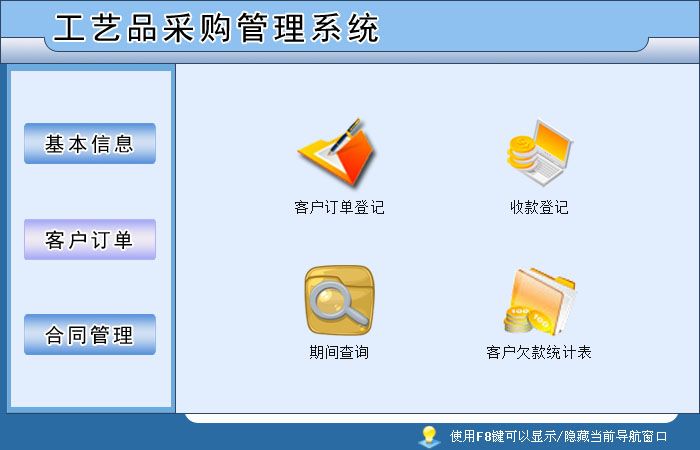 《工艺品采购管理系统》是一款为工艺品加工公司售所设计的一款软件,它可以记录客户订单信息、客户订单收款信息、客户的欠款统计、对于公司加工不了的产品由供应商加工的需要做合同登记、合同付款以及欠供商统计等管理。可提高工作效率,具体功能包话如下: 该软件的功能主要包括: 1、基本信息(产品信息、客户信息、供商信息、业务员、本单位信息); 2、客户订单(客户订单登记、收款登记、期间查询、客户欠款统计表 ); 3、合同管理(合同登记、付款登记、供商查看、供商历史查看、欠供商统计表、退货登记); 软件特点如下: 1.界面设计简洁、美观、操作流程人性化,普通用户不需培训也能很快上手; 2.支持数据与execel的导出与导入。