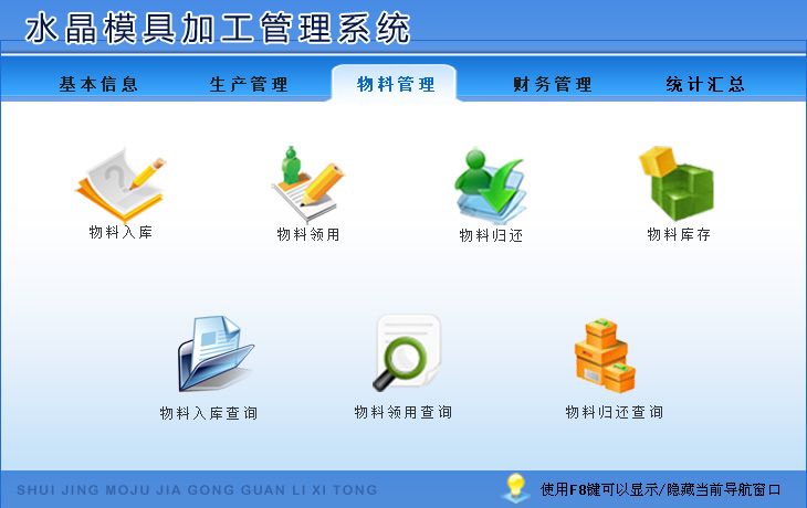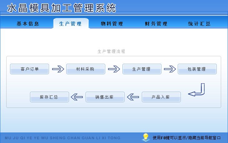 《水晶模具加工管理系统》是根据水晶模具行业、工艺玻璃行业要求开发的。系统包含基本信息、生产管理、物料管理、财务管理、统计汇总五大模块。 具体功能包含: 1、基本信息:员工信息、物料信息、单位设置、工序名称 2、生产管理:客户订单、材料采购、生产管理、包装管理、产品入库、销售出库、库存汇总 3、物料管理:物料入库、物料领用、物料归还、物料库存、物料入库查询、物料领用查询、物料归还查询 4、财务管理:客户付款、员工工资领取 5、统计汇总:员工工资期间查询、员工工资明细、订单查询、员工工资、生产进度、客户出库查询、客户款统计
