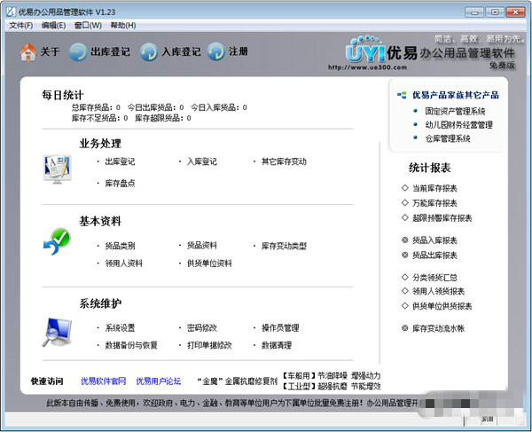系统构成:基本资料、业务处理、统计报表、系统维护四个功能模块组成。系统主要包括功能:领用、入库、出库、盘点、借入借出等其它库存变动。