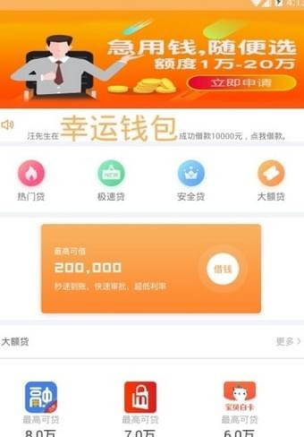 1、[闪电贷款]:一键申请,30秒审批,当天到账,快贷不等贷。2、[额度灵活]:500-5000元小额贷款任你借款,额度可达20万。